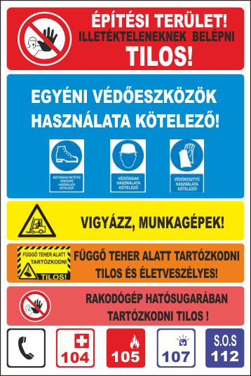 Balesetek, sérülések elkerülése érdekében kihelyezendő, szabványos figyelmeztető és tiltó jelzések, melyek egyértelműen felhívják a figyelmet a lehetséges veszélyekre.