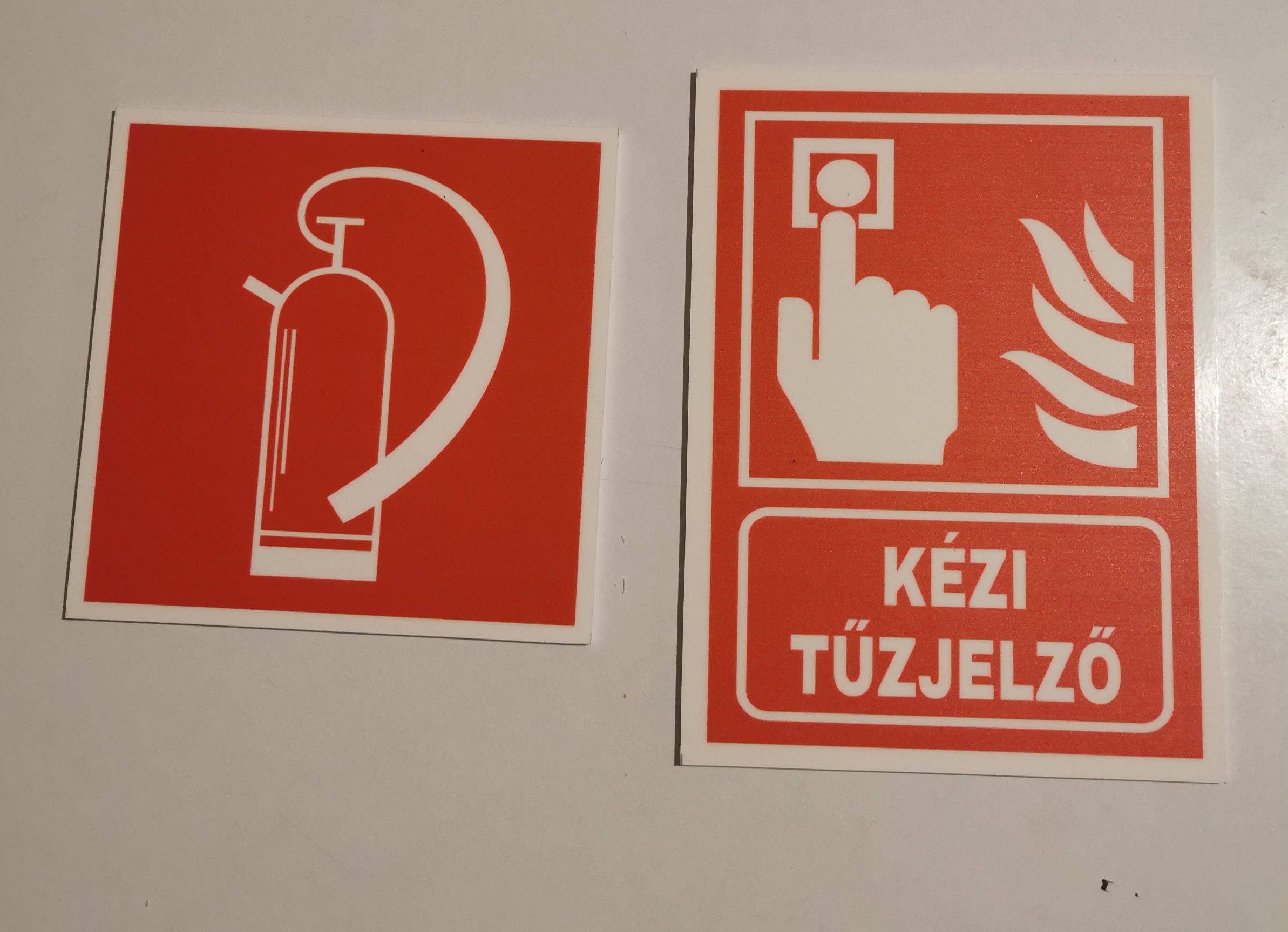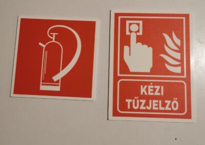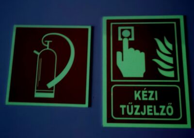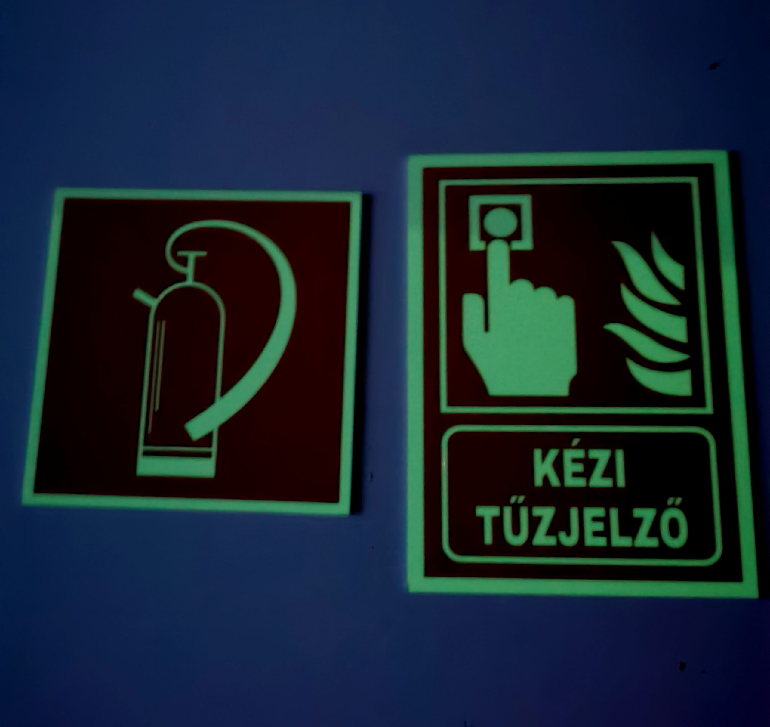 Szabványos méretű és megjelenésű utánvilágító (lumineszcens) táblák és feliratok, melyek sötétben is jól látható módon jelzik a kijáratokat, menekülési utakat, tűzoltó berendezések helyét és egyéb fontos információkat.